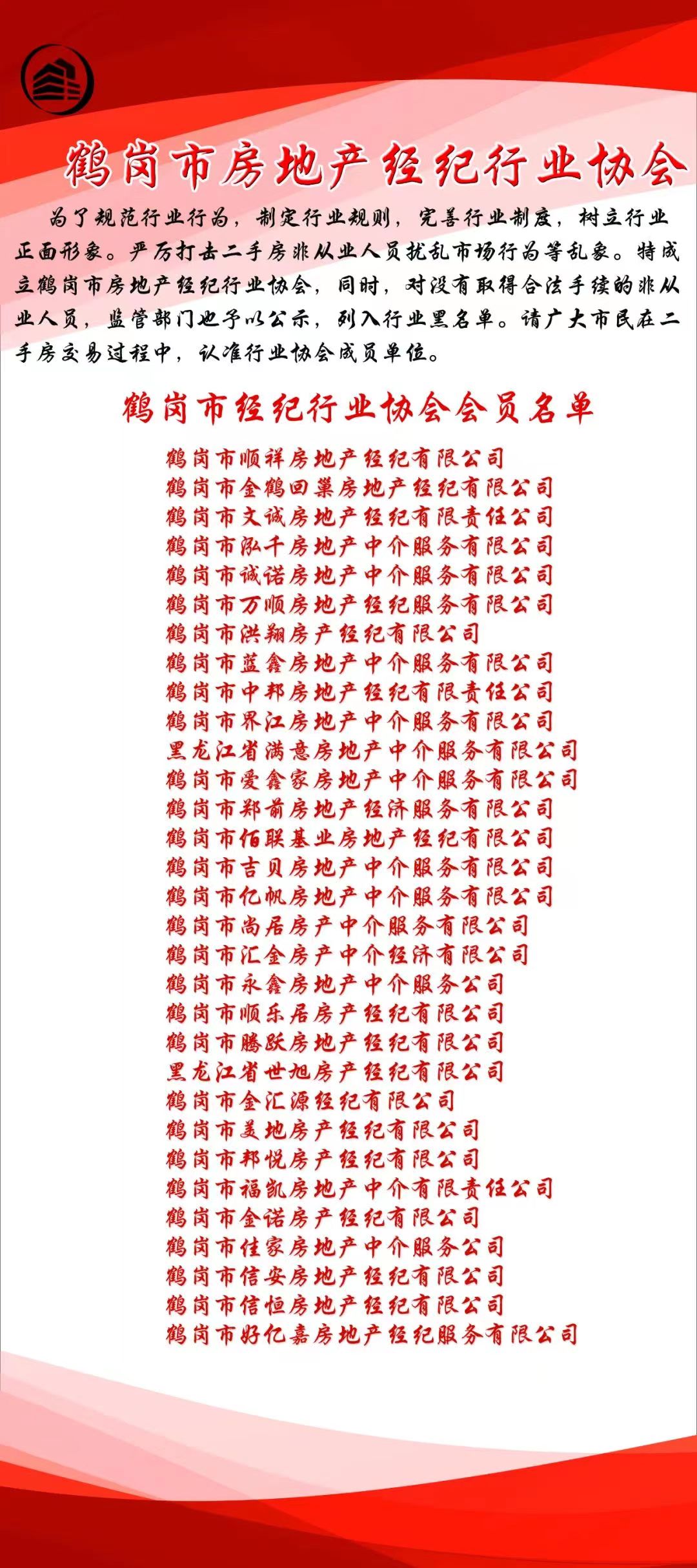 为了规范行业行为,制定行业规则,完善行业制度,树立行业正面形象。严厉打击二手房非从业人员扰乱市场行为等乱象。特成立鹤岗市房地产经纪行业协会,同时,对没有取得合法手续的非从业人员,监管部门也予以公示,列入行业黑名单。请广大市民在二手房交易过程中,认准行业协会成员单位。