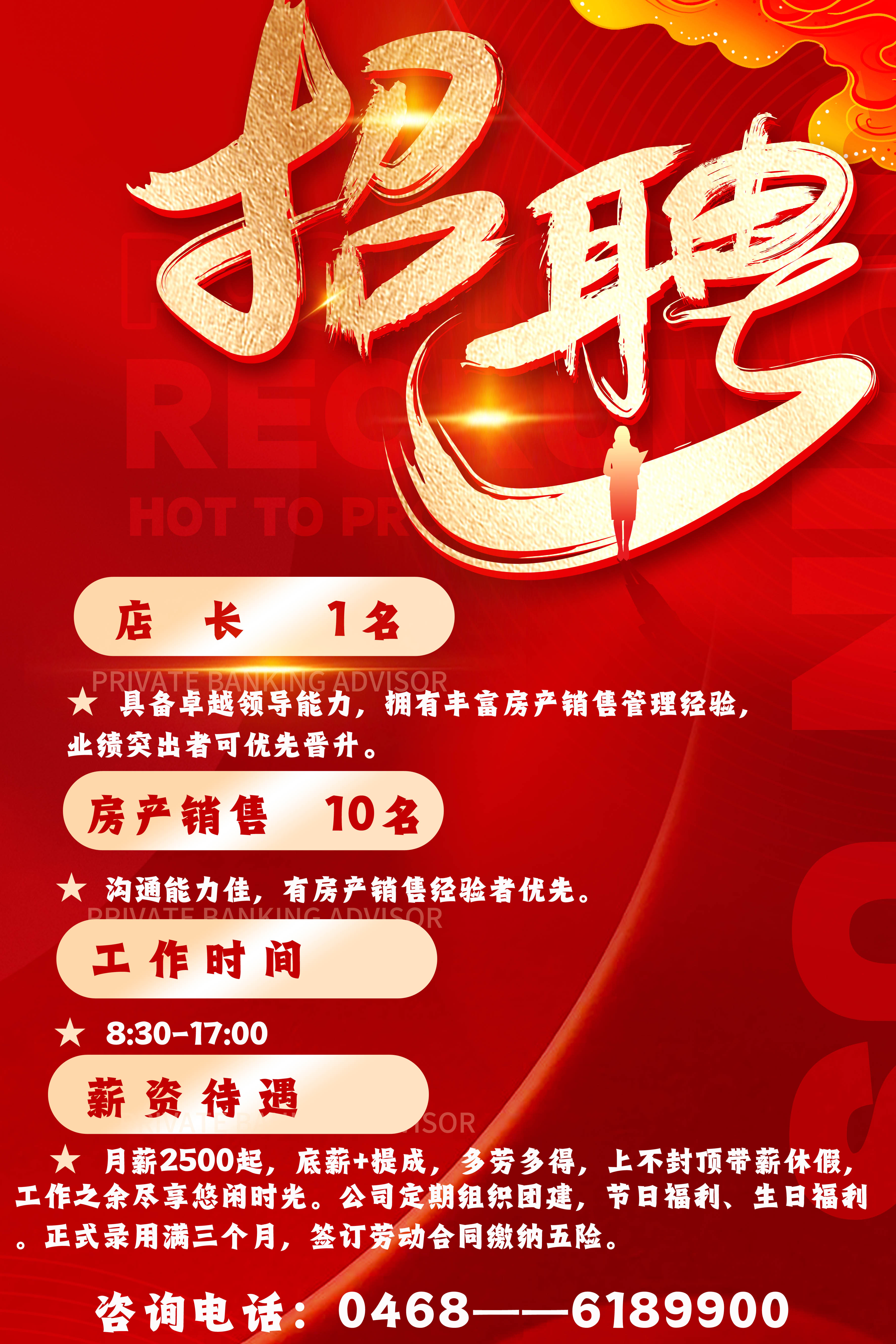 想在房产行业一展身手,实现自我价值吗?顺祥房产现诚聘以下岗位: 1. 店长:1名 要求:具备卓越领导能力,拥有丰富房产销售管理经验,业绩突出者可优先晋升。 2. 房产销售:10名 要求:沟通能力佳,有房产销售经验者优先。 工作时间:8:30-17:00 薪资待遇: - 月薪2500起,底薪+提成,...
